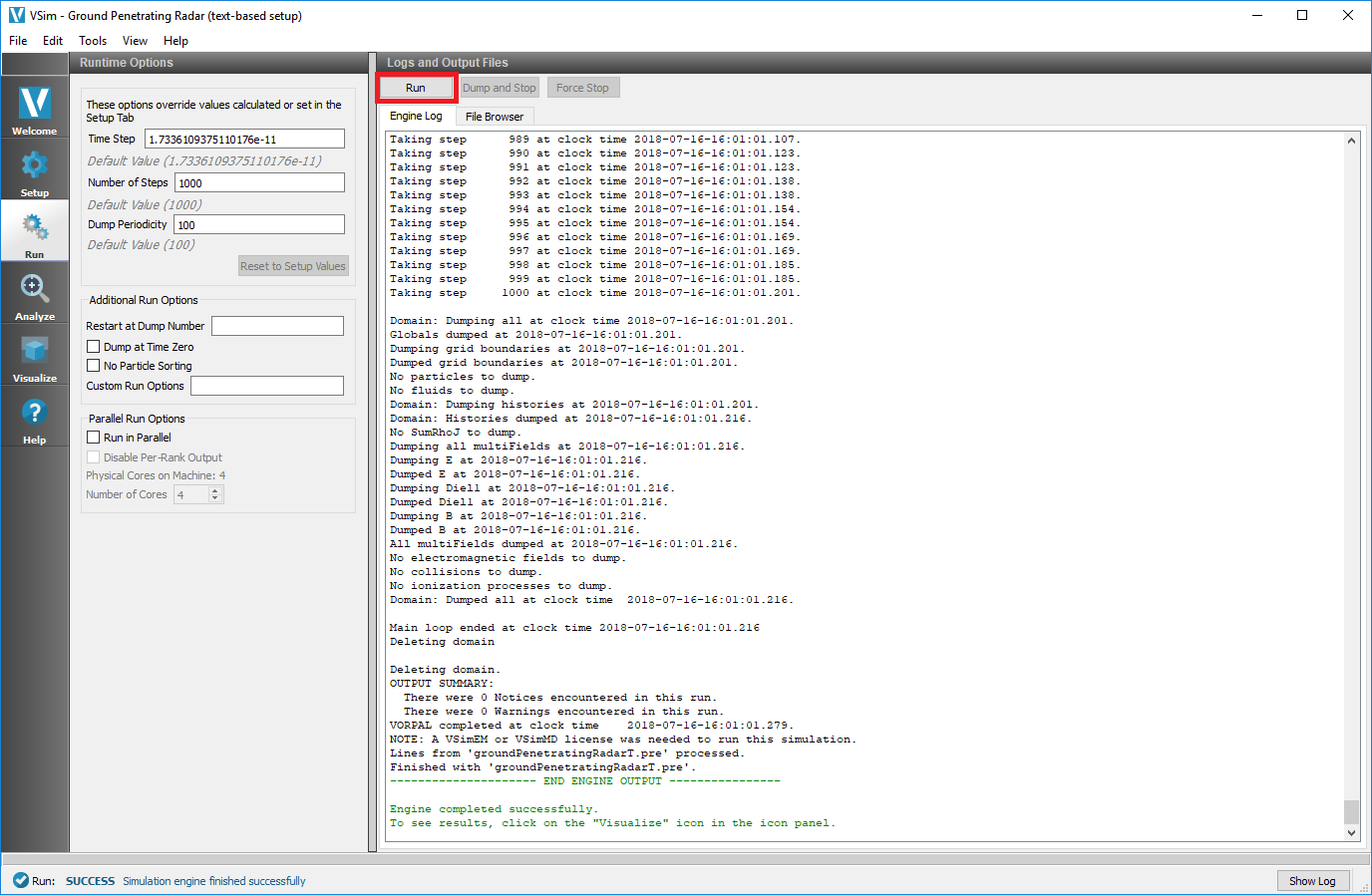 The GSimComposer Run window contains two panes. As displayed in The Run Window, the Runtime Options pane is on the left and the Logs and Output Files pane is on the right, which contains an Engine Log and a File Browser tab.