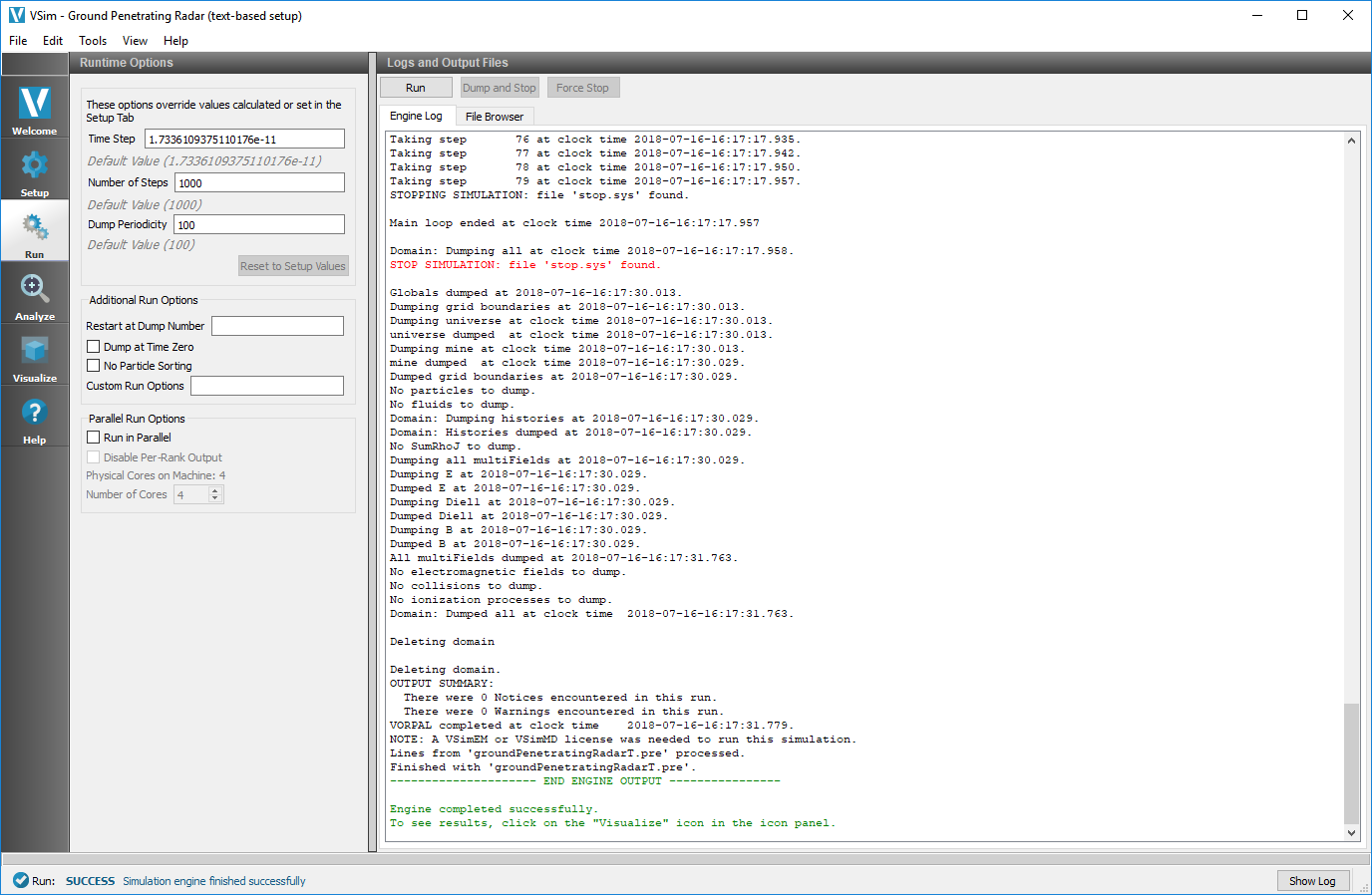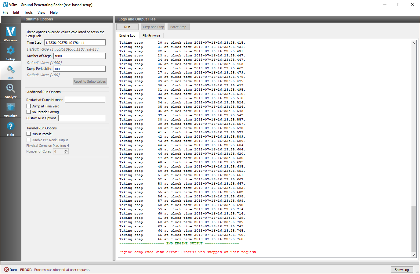 GSimComposer features the ability to Dump and Stop and Force Stop a simulation. The buttons for these actions are located next to the Run button. The two actions have slightly different uses. The Dump and Stop button is to halt a simulation that is running normally to free up the processors used for another task, or so that one may vary the parameters and restart. When a simulation is stopped it will dump all field and history data, so that it may be restarted from the same point later. The output of a successfully stopped simulation is shown in Stopped Simulation.