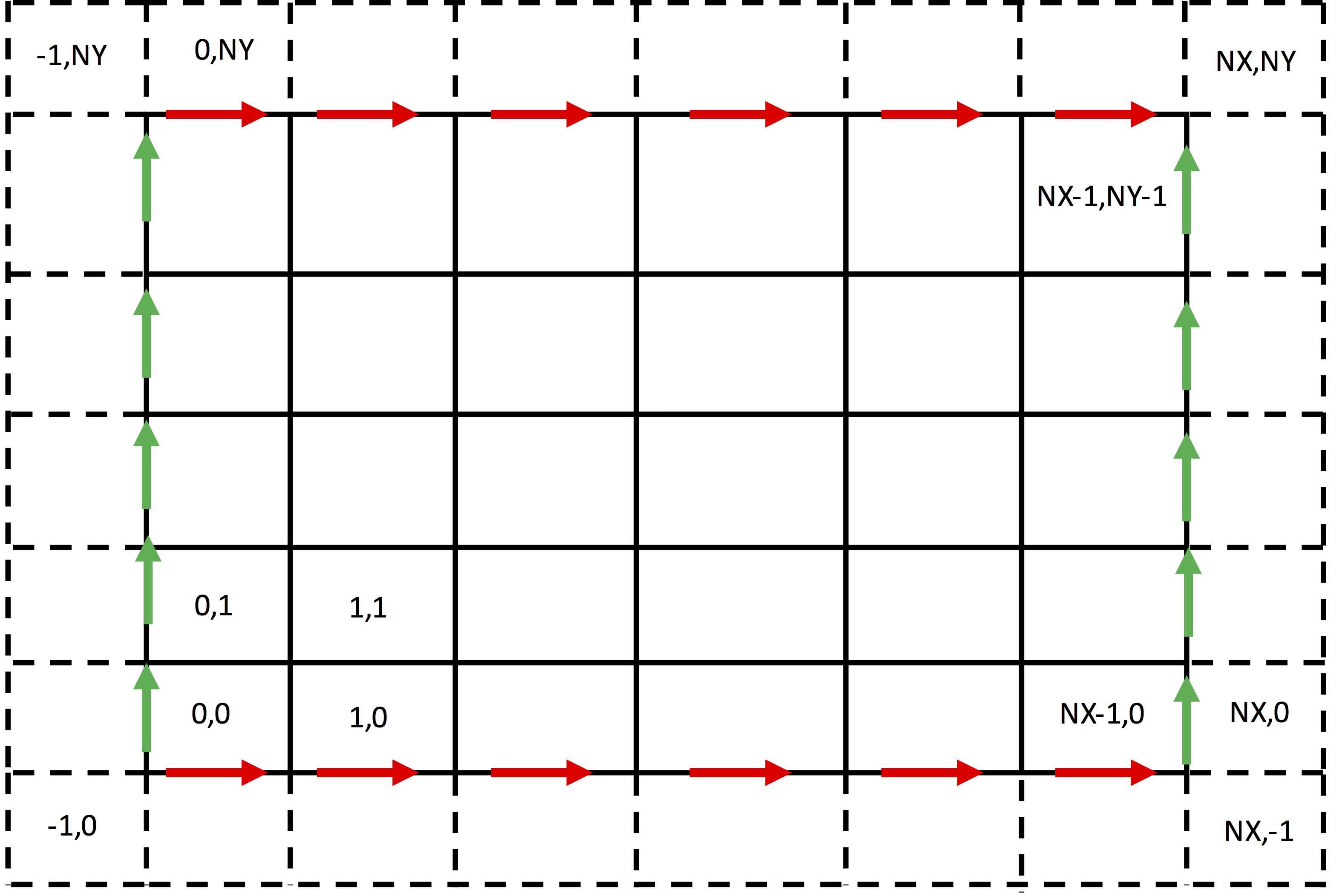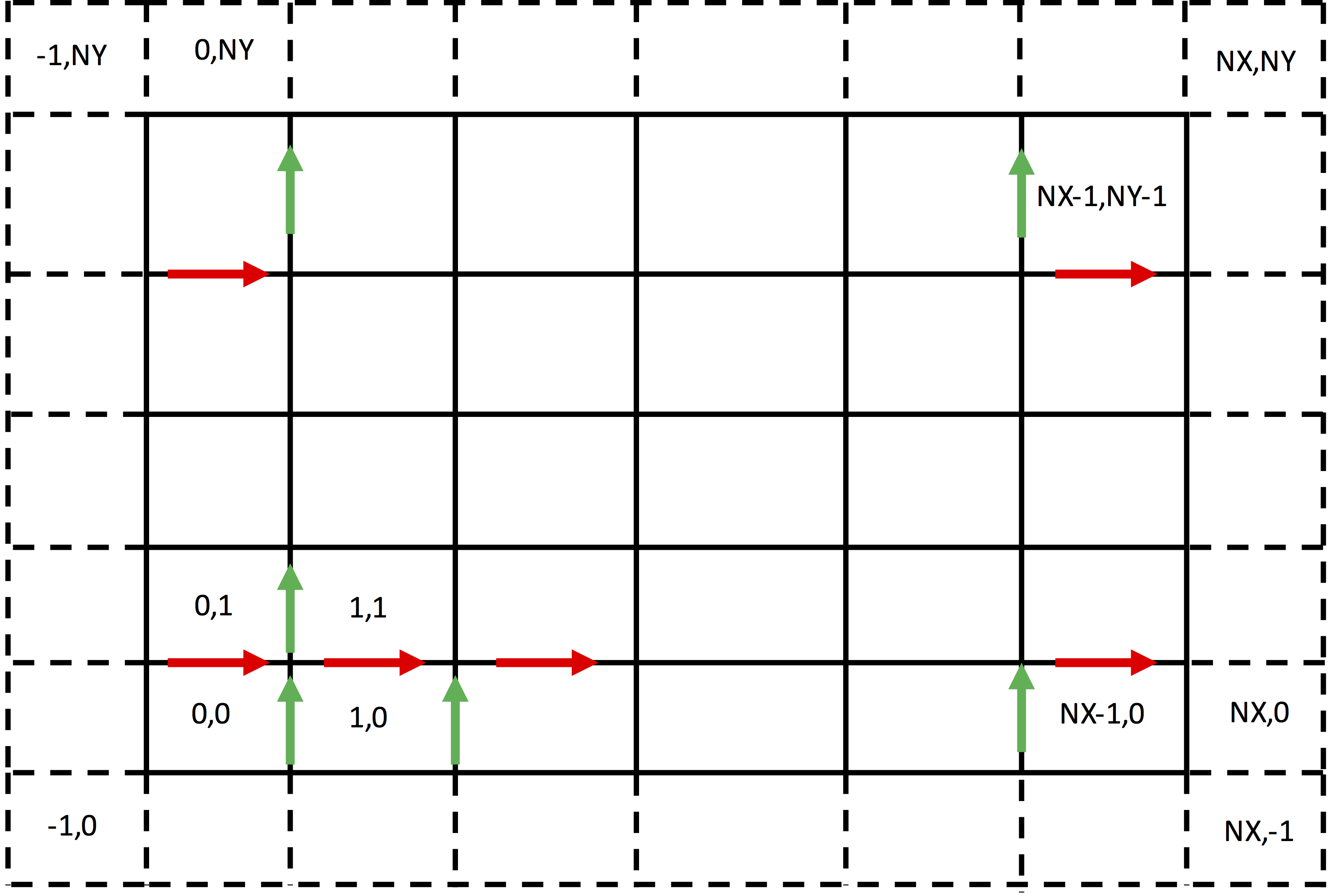 The update region is over the interior of the simulation. This varies for different components of the electric field and is illustrated in Update region for the electric field.. The electric field in the x direction, shown in red, lies on x edges. The interior x edges have lower-left cell of (0,1) and upper-right cell of (NX-1,NY-1). In Vorpal, the region is greater than or equal to the lower bounds and less than (not equal to) the upper bounds. Hence, the update slab for \(E_x\) is [(0,1),(NX,NY)]. By similar reasoning, now referring to the green arrows, the update slab for \(E_y\) is [(1,0),(NX,NY)].